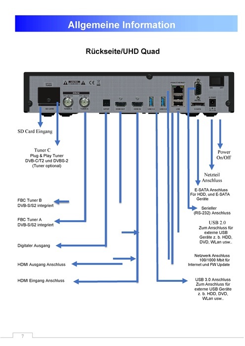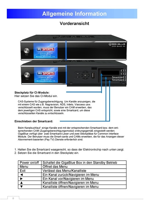 Die GigaBlue UHD Quad 4K ist ein moderner digitaler Satellitenreceiver, der mit einem schnellen 2×1,7 GHz Prozessor und 4 GB Arbeitsspeicher ausgestattet ist. Dieses Handbuch soll Ihnen helfen, Ihre GigaBlue Box optimal zu nutzen und die zahlreichen Funktionen kennenzulernen.